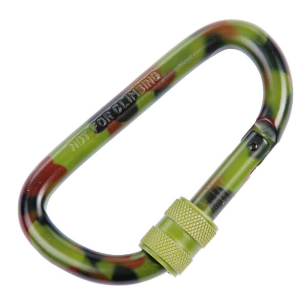 Aluminium karabiner om uitrusting snel ergens aan te hangen. Schroefsluiting. – NIET voor klimdoeleinden of abseilen! – Afmeting plm. 80 mm. – Gewicht: 20 g – Kleur: camo.