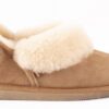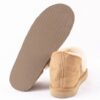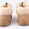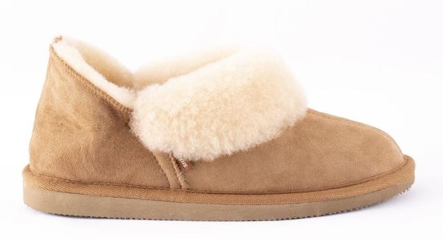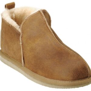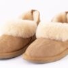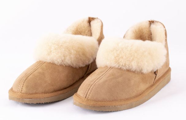 Zachte enkelhoge pantoffels van schapenvacht voor dames. De pantoffels hebben decoratieve stiksels op het oppervlak en een brede kraag van schapenvacht aan de voorkant. Ze hebben een stoffen binding rond de zool. De buitenzool is gemaakt van EVA. Dit staat voor Ethyleen Vinyl Acetaat. Dit materiaal zorgt ervoor dat het stevig is, maar ook zeer licht.