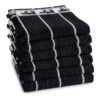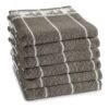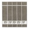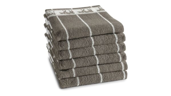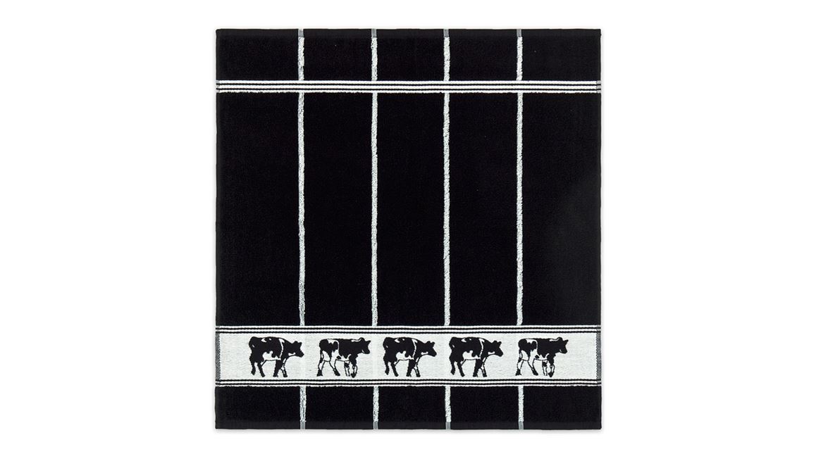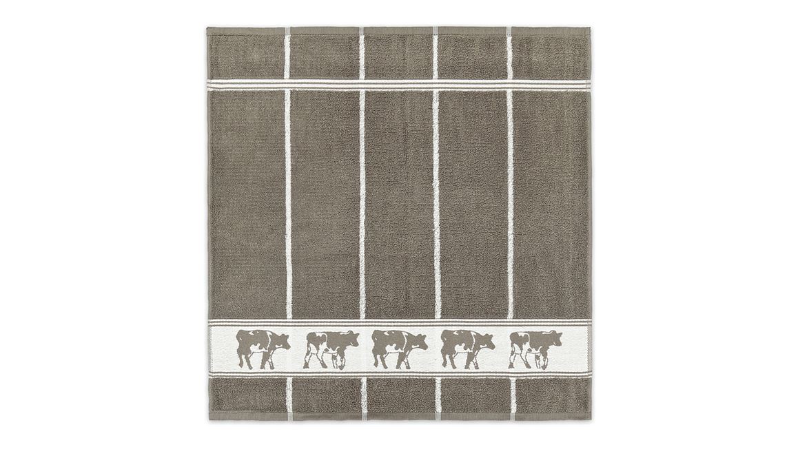 De zwart bont koeien van DDDDD zijn al jarenlang populair in Nederlandse keukens. Deze keukendoek is voorzien van witte strepen in een taupe achtergrond. In de border siert de Hollandse zwart bonte koe.
