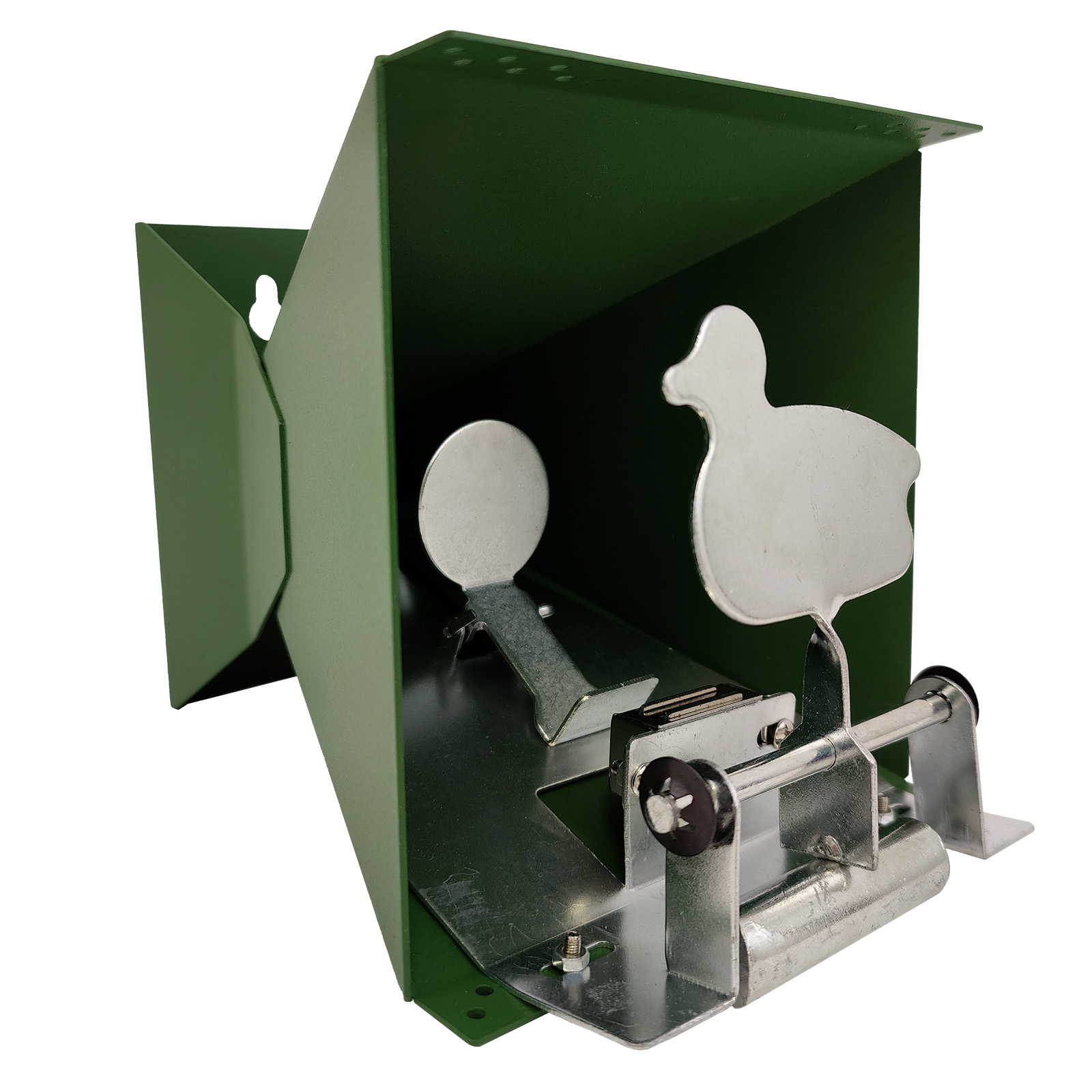 Kogelvanger met een omklapbaar eendensilhouet. Schiet hem om en schiet daarna het ronde schijfje om en de eend staat weer ‘op zijn pootjes’. Afmetingen: 14x14cmcm