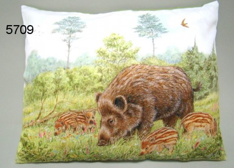 Kussen bedrukt met een tafereel van een wild zwijn met haar frislingen. Inclusief kussenvulling.