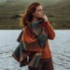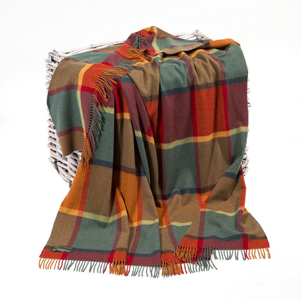 Lamswollen plaid in een oranje-groen-geel en wijnrode ruit. Deze grote lamswollen plaids zijn niet alleen bijna onmisbaar in elk huis maar ook ideale picknickdekens, om over het hoofdeinde van een bed te gooien of om er in een stoel in te knuffelen.