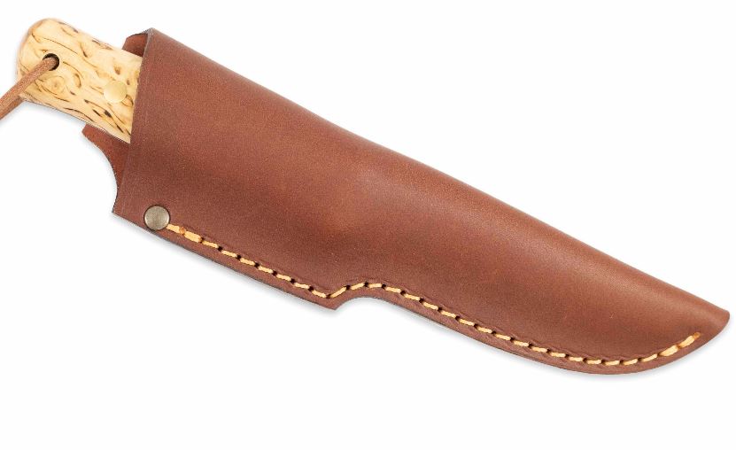 Het handvat is gemaakt van geselecteerde krulberk behandeld met een traditioneel Scandinavisch lijnoliemengsel. Een stevige en diepe schede van plantaardig gelooid leer en een leren riem voor het handvat worden meegeleverd.