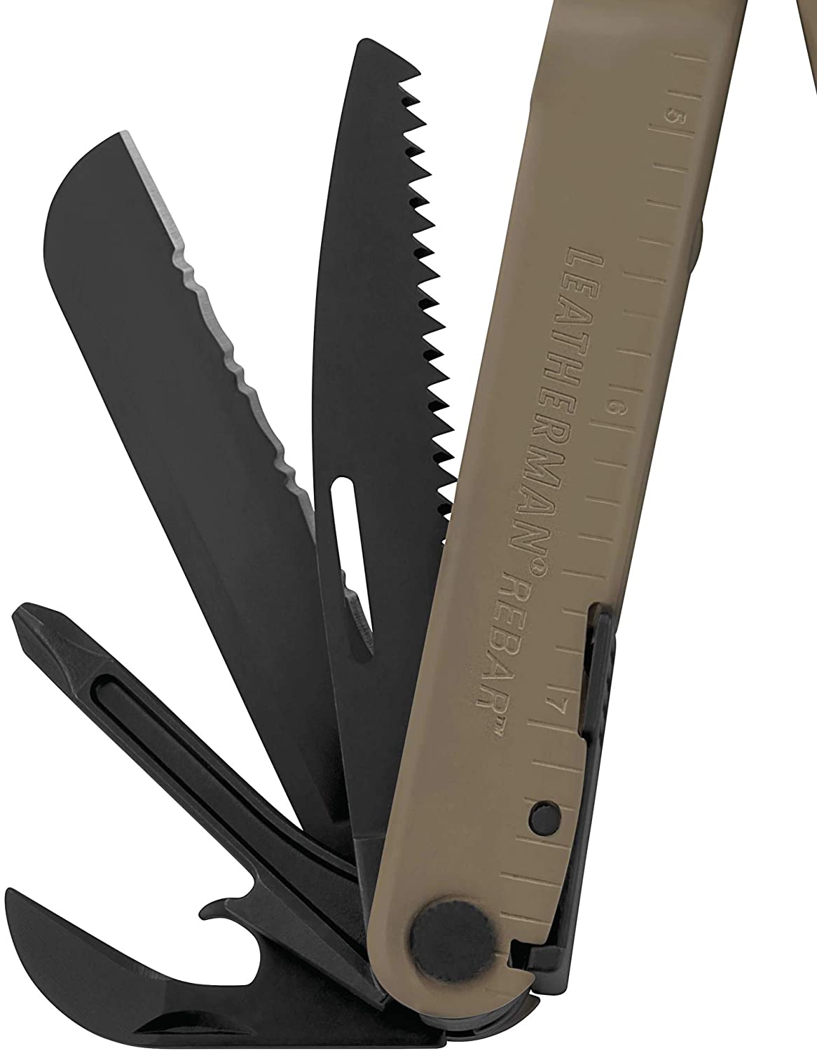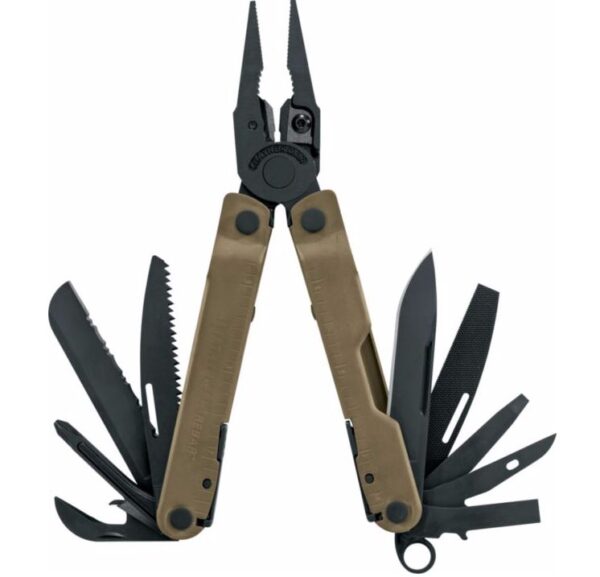 Deze tactische Coyote-Tan uitvoering is een speciale uitvoering van de Leatherman Rebar met mat zwart gecoate onderdelen. 17 Tools: