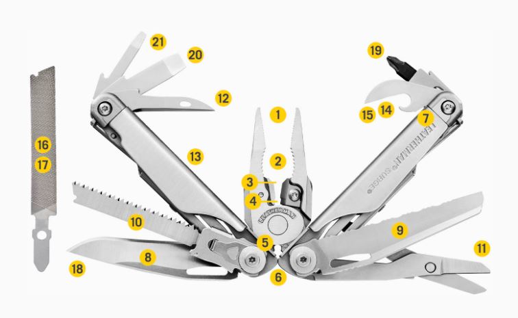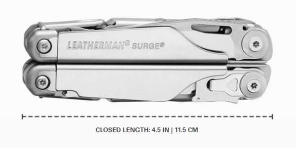 De Leatherman Surge is een van Leatherman’s twee grootste multitools; een echte krachtpatser, gebouwd met de grootste tang, langste multitoolbladen. Een unieke houder voor verwisselbare messen, vervangbare hoogwaardige draadknippers en vier messen die naar buiten kunnen worden geopend, geven snel toegang tot de gereedschappen die het meest gebruikt worden.