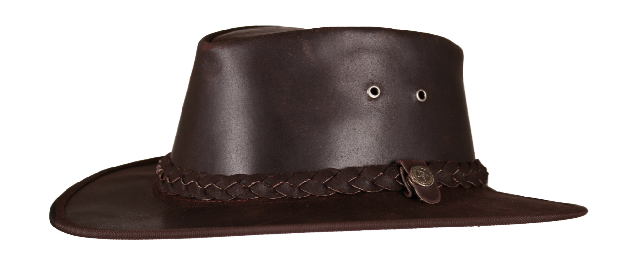 Leren hoed met gevlochten hoedband.