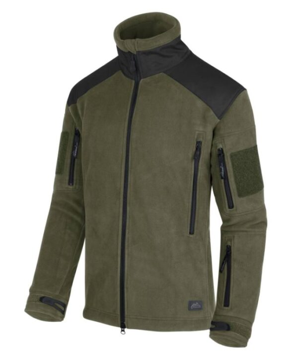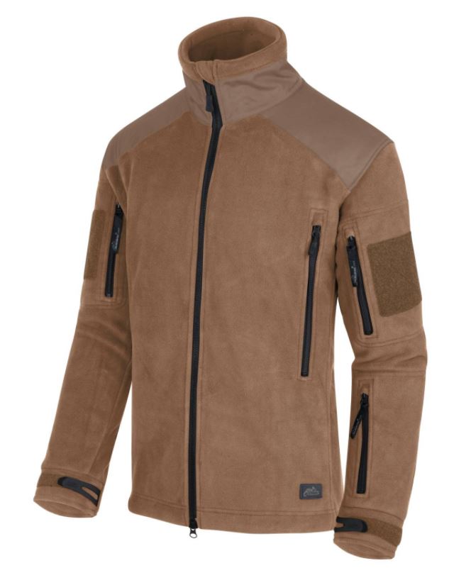 This warm and sturdy heavy fleece jacket features quality double superfine fleece, a high collar and a strong full-front zipper as well as re-inforced cordura material on both the upper chest and the backs of the sleeves. Furthermore it goes with two chest pockets, two upper pockets on each sleeve and one lower pocket on the left sleeve, and a large pocket on the lower back. All pockets with zipper. What is more it has Velcro plates on each arm, armpit ventilation zippers, adjustable Velcro wrist cuffs and drawstring waistband with cord lock. Ideal for fishing, hunting and a lot of other outdoor activities.