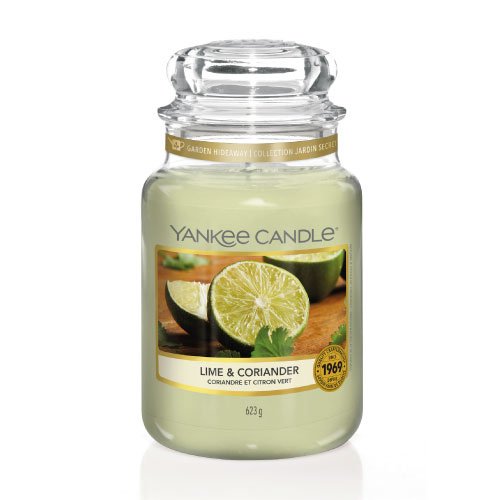 Yankee Candle Lime & Coriander geurkaars in een grote glazen pot. Tuinverse metgezellen – zoete, sappige limoenen en bladkoriander vullen de lucht met een vers geplukte geur.