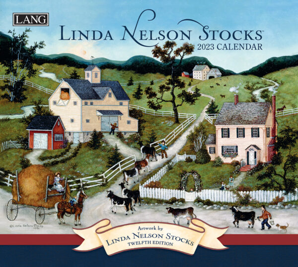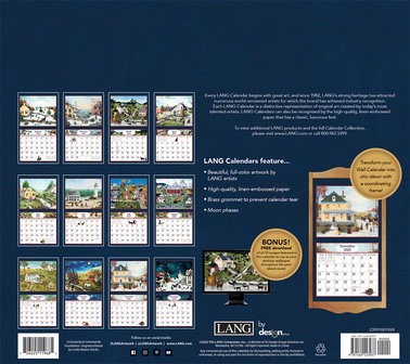 Amerikaanse Lang kalender. LANG-wandkalenders hebben maandelijkse full colour afbeeldingen, elegant linnen reliëfpapier en een koperen oogje om op te hangen.