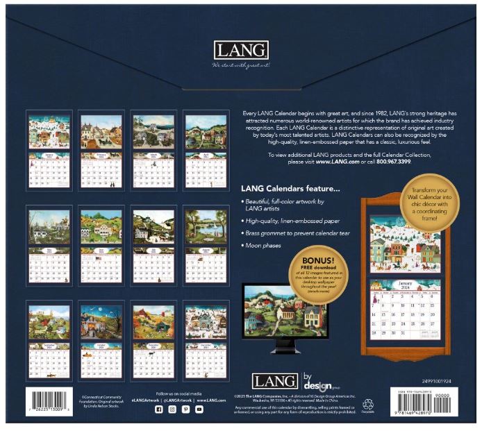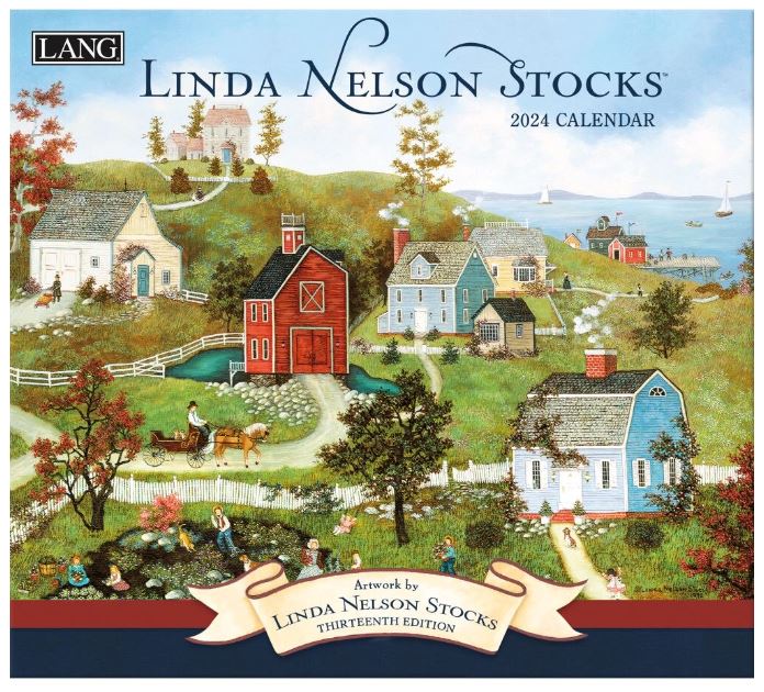 De Linda Nelson Stocks 2024 wandkalender is versierd met haar gedetailleerde kunstwerken die landelijke gemeenschappen door elk seizoen afbeelden.