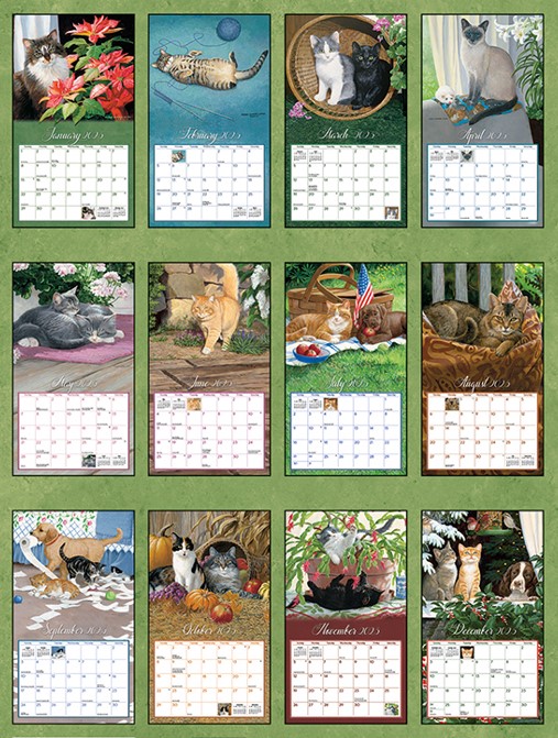 Amerikaanse Lang kalender. LANG-wandkalenders hebben maandelijkse full colour afbeeldingen, elegant linnen reliëfpapier en een koperen oogje om op te hangen.