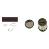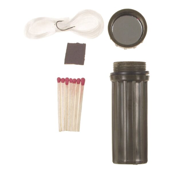 Waterdichte lucifercontainer met vishaak en vislijn plus vuurstarter en spiegeltje. En een wrijfvlak voor lucifers, uiteraard.