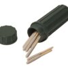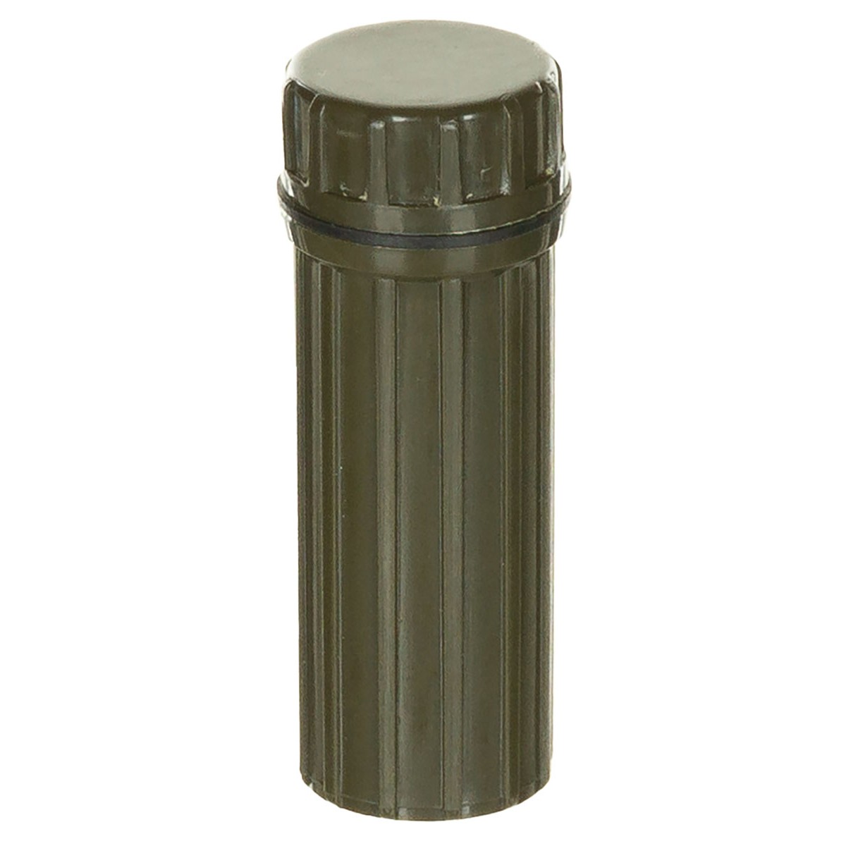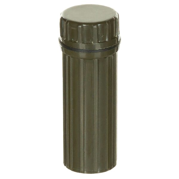 The screw-capped, cylinder-shaped waterproof matchbox is made of olive drab plastic. It consists of two parts, the body and the screw top. The body has longitudinal grooves and ribs to facilitate a tight grip in wet conditions. A sealing gasket fits inside the screw cap to provide a tight seal when the cap is tightened on the body. On the outside bottom of the container there is a striking bar. When struck with the point of a knife, bayonet or other metal, the striking bar produces a spark which will ignite light tinder materials.