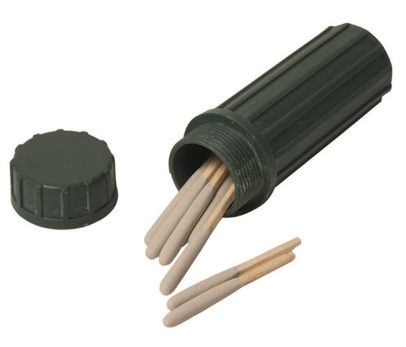 Waterdichte container voor lucifers. Afmeting: ca. 7,5 x 2,5 cm. Met een kleine vuursteen aan de onderzijde.