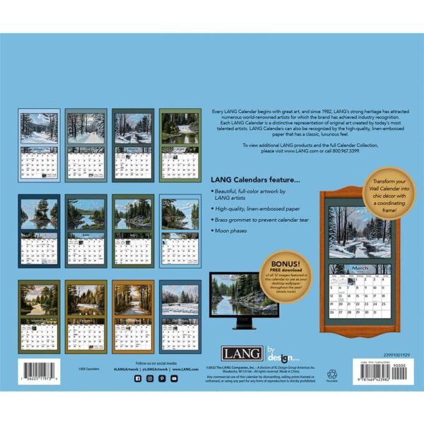 Amerikaanse Lang kalender. LANG-wandkalenders hebben maandelijkse full colour afbeeldingen, elegant linnen reliëfpapier en een koperen oogje om op te hangen.