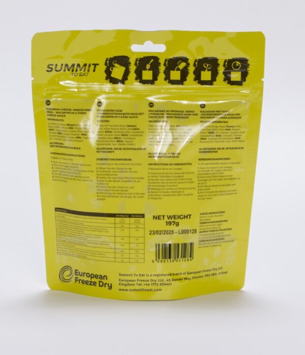 Gekookte droge pasta (tarwe) (16%), volle melk (28%), slagroom (melk) (20%), blokjes gesneden uien (10%), geraspte Red Leicester Cheese (melk) (7%), geraspte Cheddar ( melk) (7%), geraspte mozzarella (melk) (3%), raapzaadolie, Maïsmeel, zout, witte peper.