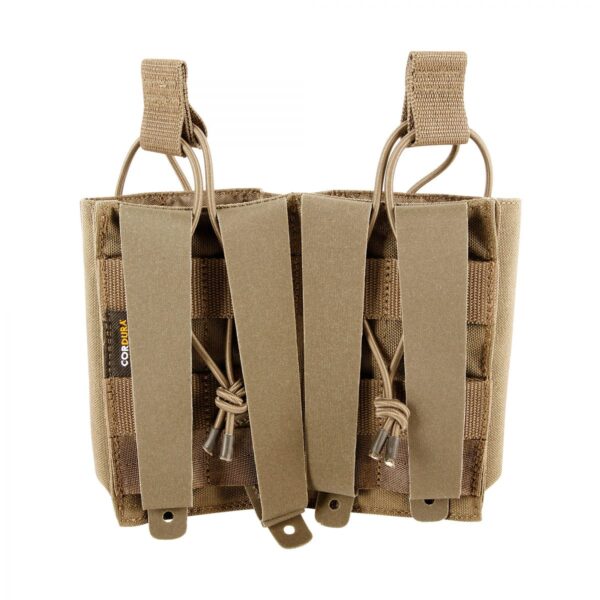 – Elastische koordsluiting; Twee enkele magazijnen – naast elkaar; te gebruiken voor G36 magazijnen, AR15, M16 etc .; Drie MOLLE-pals op de voorkant.