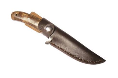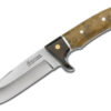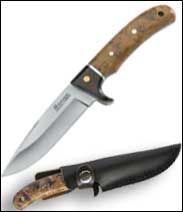 The handle on this stylish and functional knife is a combination of Rosewood and Root Wood. — This fine knife features a hollow ground drop point blade made of 440 stainless steel and has a top swedge. The Elk Hunter also features full tang construction, integral finger guard and a lined lanyard hole. A genuine leather sheath is included. Handle Material: Rosewood & Root Wood Blade-Steel: 440 Stainless Steel