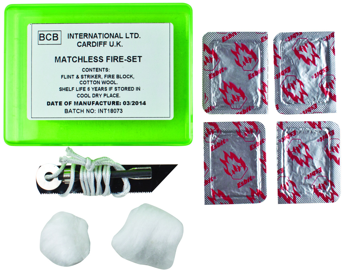 Vuurstartset. Deze set bevat hexamineblokken, gecomprimeerde watten, tampons en een vuurstaal.