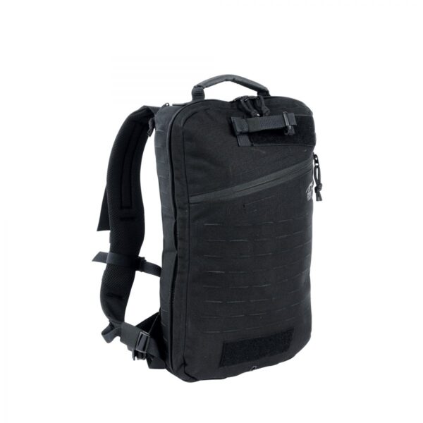 Tasmanian Tiger medische rugzak. Platte Medic-rugzak met intelligent, overzichtelijk interieur. Het MOLLE-systeem aan de voorkant en zijkanten is lasergesneden. De lichtgewicht gewatteerde schouderbanden kunnen worden losgemaakt en opgeborgen in een zak met klittenbandsluiting aan de achterkant, en de rugzak wordt geleverd met een heupriem zodat deze kan worden aangepast aan een scherfvest.