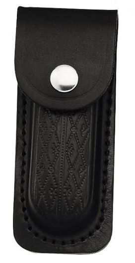 Leren etui met reliëfpatroon en riemlus dat in de lengte of dwars aan de riem kan worden bevestigd. Geschikt voor messen met een handvatlengte van 11 cm. – Gewicht: 48 g – Lengte: 14,0 cm