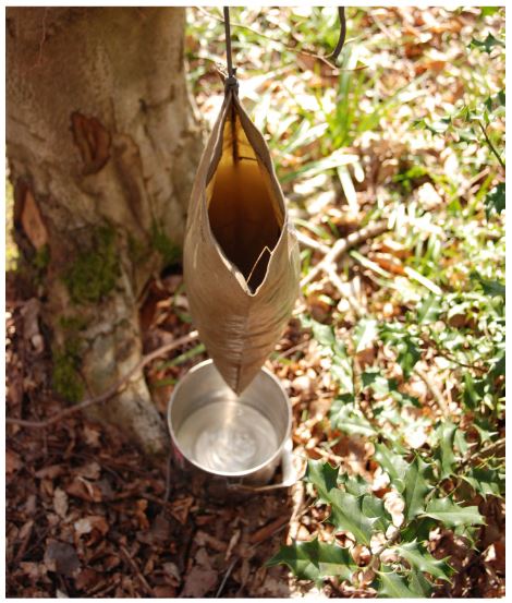 ? Hang de zak op en wacht met het opvangen van gefilterd water totdat het waterpeil is gedaald tot de aan de op de zak genaaide vullijn