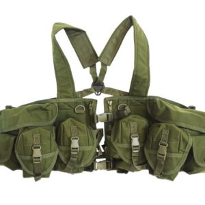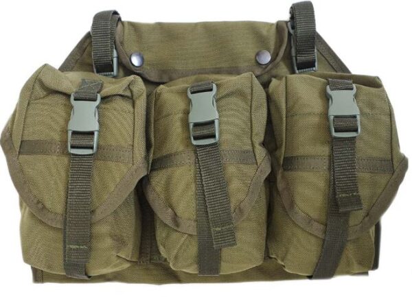 To give additional ammunition carriage capacity, this mini rig previously allowed convenient mounting high on the chest. An innovative new design allows the rig to be mounted as before on the chest, but also on the thigh or to be worn as a bandoleer. The rig is essential for situations where ammunition capacity is a concern. 3 x Ammo pouches; Map pocket.