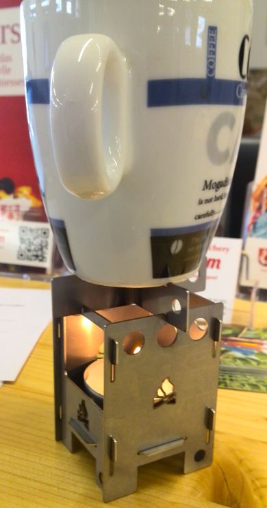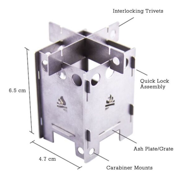 Het perfecte kado voor de bushcrafter en andere buitenmensen. De mini stove is de kleinste werkende houtbrander ter wereld. Leg er een waxinelichtje in en u heeft een sfeervol windlichtje waar u ook iets op warm kunt houden. Kan ook overweg met brandpasta, esbit of hexamine tabletten en met een niet te grote spiritusbrander. Met zijn 77g en een afmeting van 6,5 x 4,7cm (uit elkaar genomen) kan het gemakkelijk meegenomen worden. Zelfs in een portemonnee of aan de sleutelbos. Elk onderdeel heeft een opening voor een koord of karabiner.
