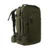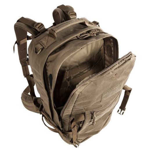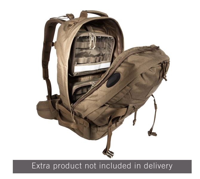 Tasmanian Tiger rugzak met voorgevormde, gepolsterde, rug. Heupriem met zakken. Handgreep, geschikt om man down aan mee te trekken. Voorbereid op gebruik met drinksysteem. Regenhoes in bodemvak. Onderverdeeld in zeven verschillende grotere en kleinere vakken. Frontlader met twee hoofd compartimenten. Zes doorvoeren voor antennes. Afneembare achterkant met aluminium frame. MOLLE compatible.