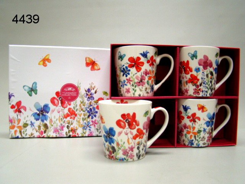 Porseleinen mok met vrolijke vlinders afgebeeld.