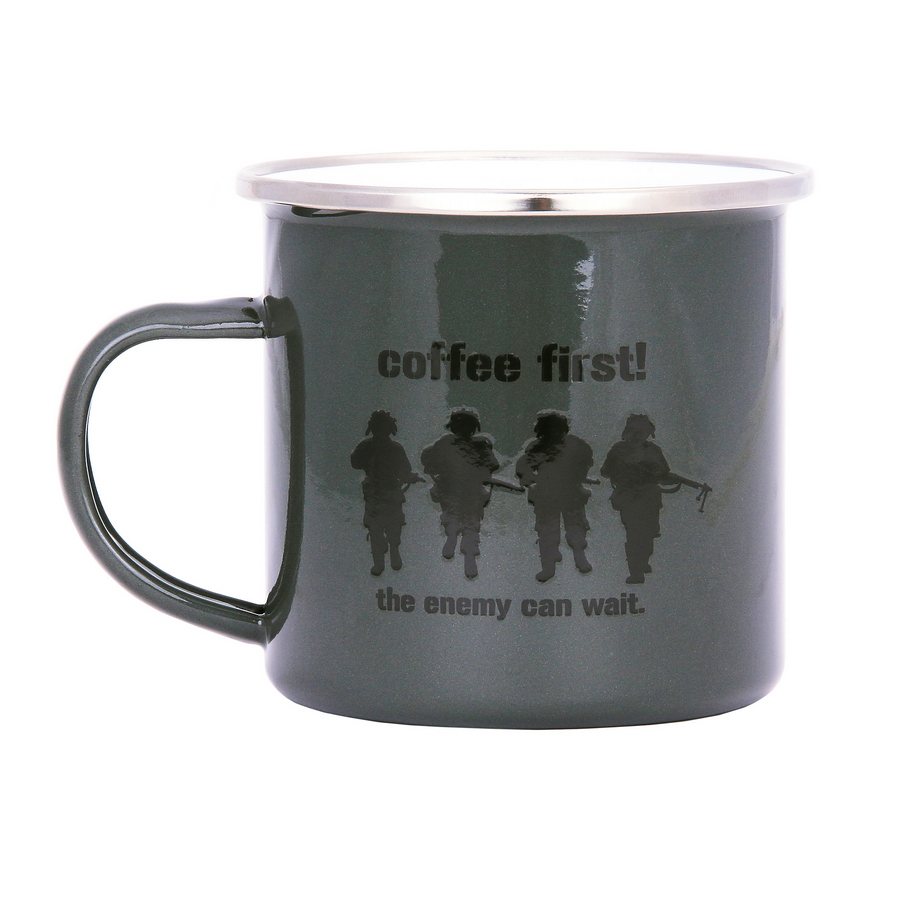 Emaille mok met “Coffee first, the enemy can wait” print. Een kwestie van prioriteiten!