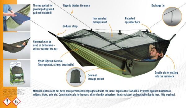 Both fabric and mosquito net are impregnated with TANATEX insect protection. This impregnation provides lasting protection against ?ying insects such as mosquitoes and biting midges as well as against crawling insects such as ticks, ants, cockroaches and mites, which will not even sit on the material or the net.