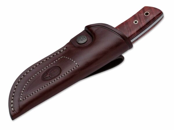 Een van de meest populaire en veelzijdige modellen van Muela is de Kodiak. De jubileumeditie maakt indruk met zijn rode schubben van gestabiliseerd esdoornwortelhout, die worden vastgehouden door twee bijzonder elegante opengewerkte mozaïeken pinnen en die zijn bedekt met zwarte fiberlagen.