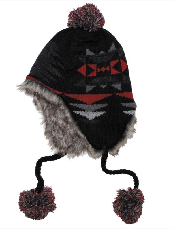 Gebreide muts met pompon en kwastjes. Gevoerd met imitatiebont. Met warme oorkleppen.