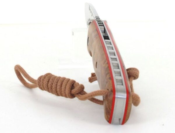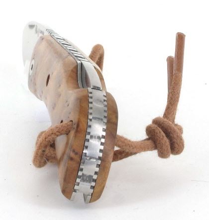 De handgreepschalen van geurig thuja-hout liggen comfortabel in de hand.