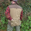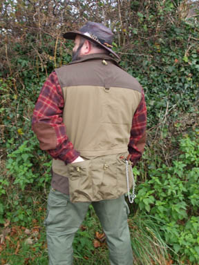 There are D-rings for accessories at each side of the waist and, in the centre of the back is a very useful, olive coloured, dog-training pouch of 3 locking drawcord closed sections, each with drain eyelets, which zips off for quick and easy washing – ideal for training dummies, leads and other items that would soon spread mud, slime, slobber etc over a normal jacket. This pouch feature makes the Nimrod waistcoat extremely practical and suitable for dog training, retrieving, beating, picking up, shooting – or even just country walking and going shopping!