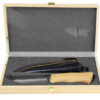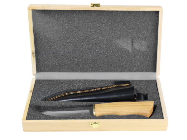 Wordt geleverd met een handgemaakte zwart lederen schede met riemlus in een luxe houten opbergkist.