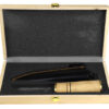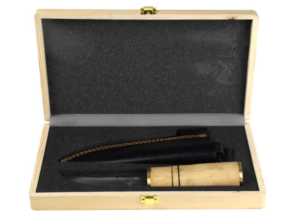 Word geleverd met een handgemaakte zwart lederen schede met riemlus en een luxe houten opbergkist.