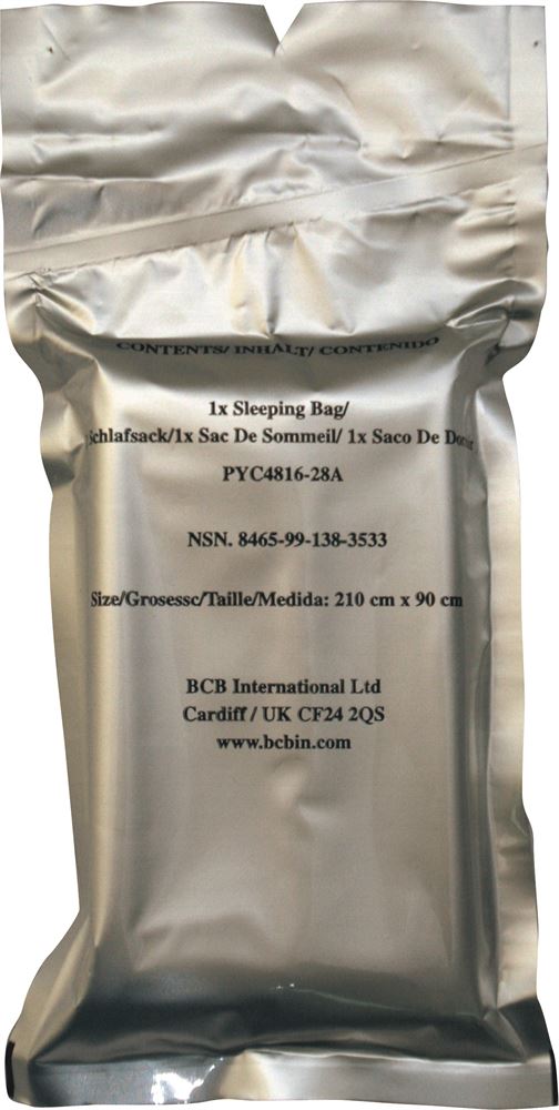 A full size poly sleeping bag. Compact and lightweight it is ideal as a shield against the elements or as a waterproof inner layer for a sleeping bag. Vacuum packed. Wight: 140g. NSN: 8465-99-138-3533