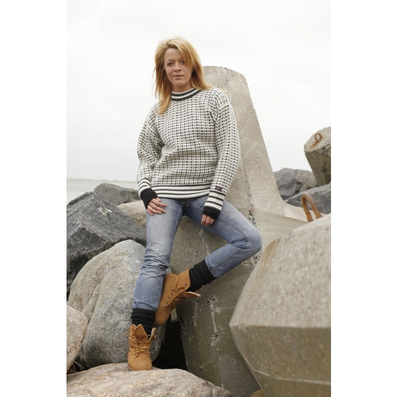 Heerlijk warme originele Noorse trui met ronde hals met een motief van de Faroër eilanden . De hals is aan de binnenzijde gevoerd met fleece. 100% Scheerwol.