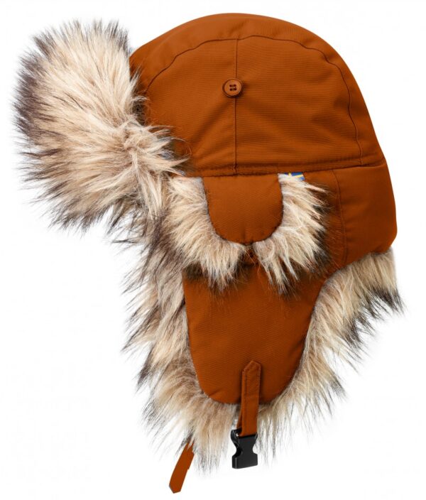The hat that can withstand both polar climates and biting winds. Extremely warm hat with synthetic fur on the peak, ear flaps and edges. Outer material in soft, quiet polyester. Ear flaps can either be folded up and fastened with a button or held in place with a strap under the chin to stay on your head in hard winds. Teflon-treated fabric wards off precipitation and dirt.
