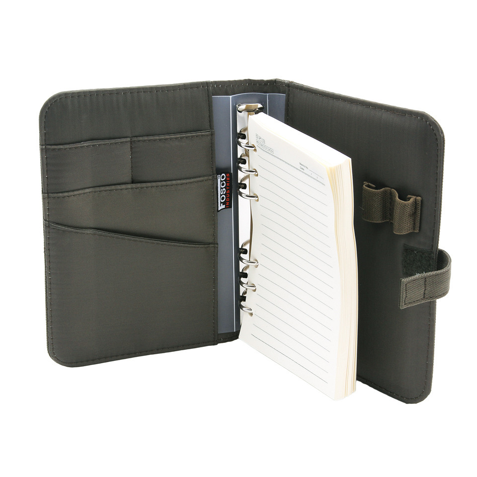 Gestoffeerd outdoor/tactical notitieboek met klittenband sluiting.