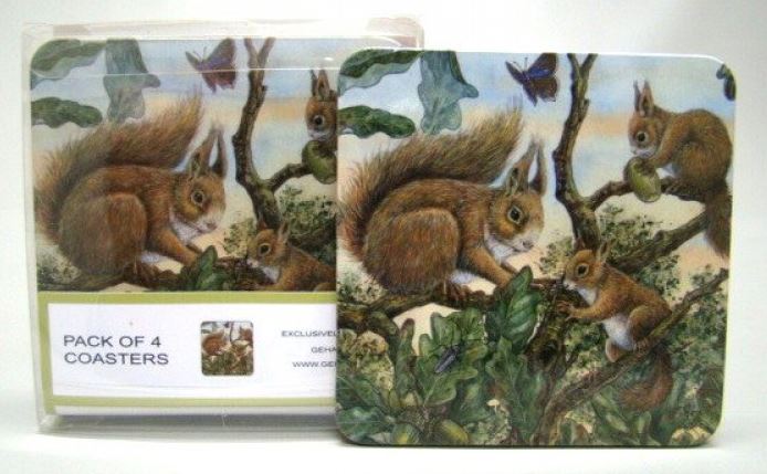 Set van vier onderzetters met een eekhoorn familie, Nat afneembaar. Kurk onderkant