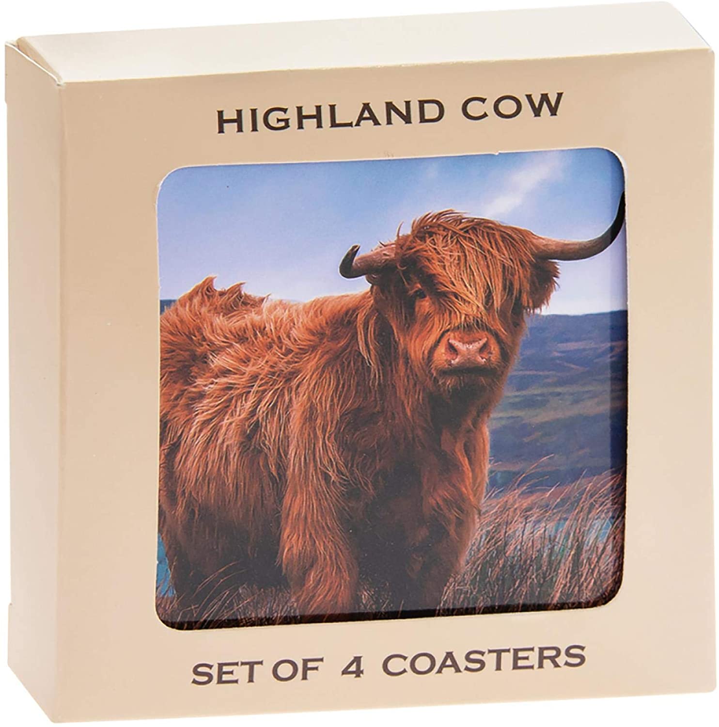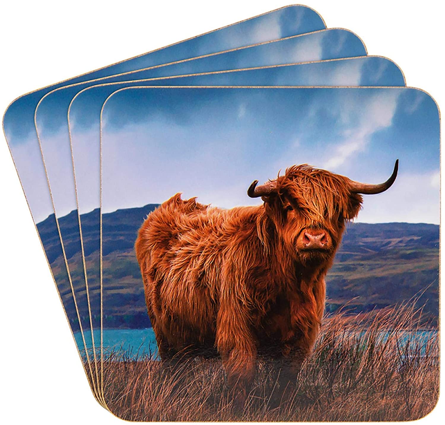 Set van vier onderzetters met prachtige foto van een Schotse hooglander koe.
