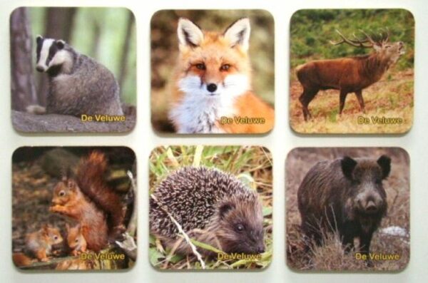 Set van zes onderzetters met afbeeldingen van dieren die je met een beetje geluk (voor de das met veel geluk) overal op de Veluwe kunt zien. De onderkant is van kurk.