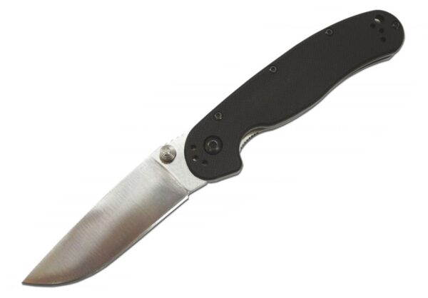 A folder from the Ontario RAT series with a flat-ground, satin-finished blade made of AUS-8 steel, removable thumb stud, convertible clip (4 positions), lanyard hole and ergonomically shaped scales made of impact-resistant nylon.