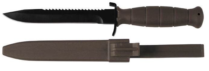 Het Oostenrijks legermes met zaagrug is een combat en survival mes, voorzien van een zaagrug. Het mes is zwartgeblakerd en anti – reflecterend ( 16,5 cm ). Het heft is voorzien van handbescherming die ook te gebruiken is als een flesopener. Handvat en schede is gemaakt van kunststof. Handvat bevat een smal oogje waar een polsriem/touw aan bevestigd kan worden. De schede is voorzien van een clip sluiting waardoor het mes gezekerd vast zit in de schede en voorzien van een clipsluiting voor aan de riem/koppel. Het mes is zowel linksom als rechtsom te dragen.