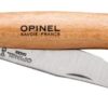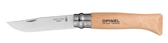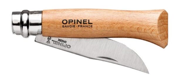 – Heft: Beukenhout. Beuken is het meest gebruikte hout voor de vervaardiging van Opinel-handvaten. Afkomstig van Franse boerderijen, is het hard, resistent en gemakkelijk te bewerken. Met een homogeen uiterlijk, varieert de lichte kleur van geel tot roze. Het is herkenbaar aan de aanwezigheid van vele kleine donkere lijntjes. Het handvat is gelakt om beter beschermd te zijn tegen vocht en vuil.