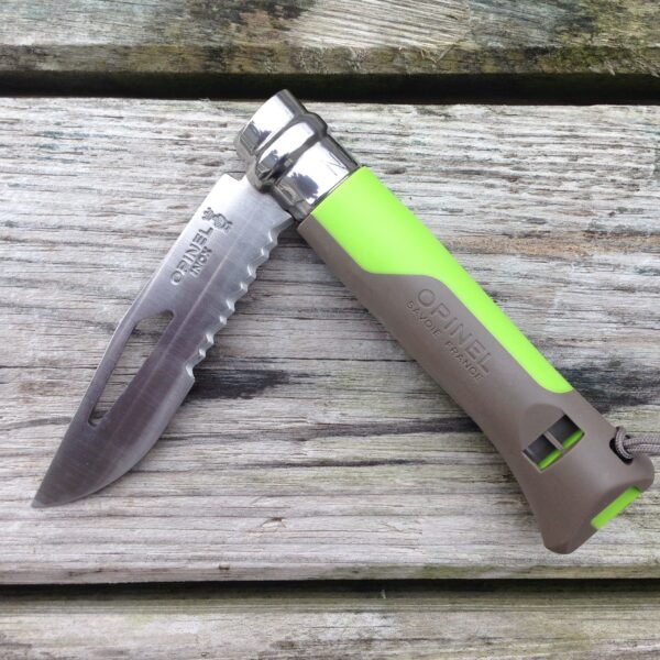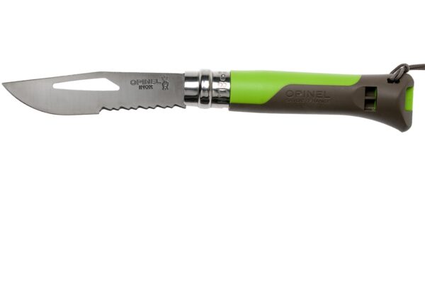 Opinel N°8 Outdoor. Het eerste Opinel mes met een kunststoffen greep. Daardoor beter geschikt voor natte omstandigheden. Het ergonomisch gevormde handvat bestaat uit twee componenten hoogwaardig kunststof en is bestand tegen extreme temperaturen van -40 tot +80 graden C. In de greep is tevens een fluit is ingebouwd, goed voor 110 decibel, hoorbaar tot meer dan 300 meter. Werkt onder alle omstandigheden.