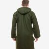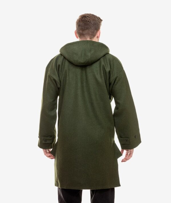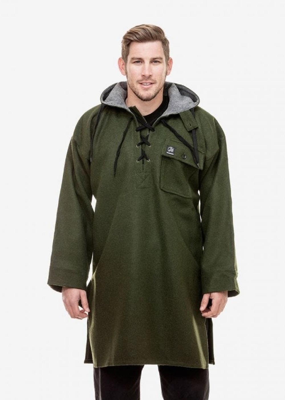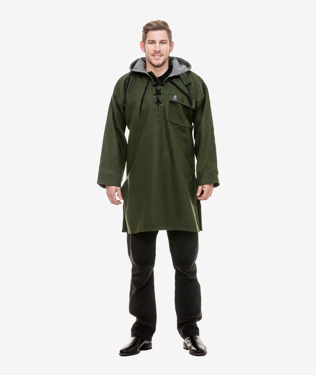 The Swanndri Original hooded bush shirt is a mid thigh length garment designed to be worn over ordinary clothing as a warm and protective outer garment. It has features which makes it especially suitable for use in outdoor sports such as bushcraft, hunting and fishing. It is made of a thick warm New Zealand wool woven fabric, lined with wool. It has side slits and under arm gussets to allow for ease of movement. It has adjustable cuff widths as well as an adjustable lace up neck front. The outer fabric of the bush shirt has been treated with the Swanndri water resistant finish.